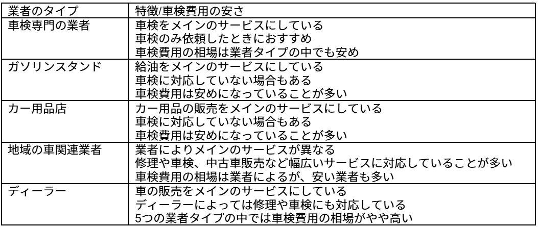 業者のタイプによって車検費用や特徴が異なります。